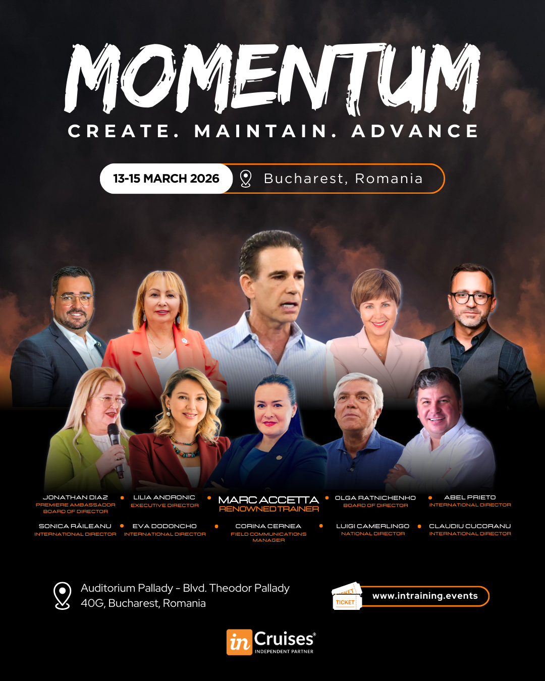 Momentum takes place on March 13–15, 2026, Auditorium Pallady (Bulevardul Theodor Pallady 40G) Bucharest, Romania